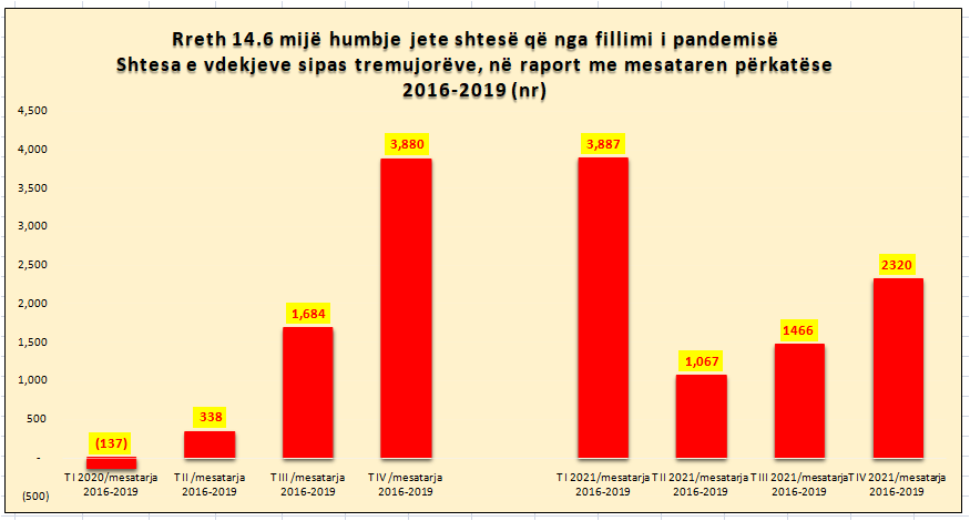 Sipas tremujorëve, shtesa më e lartë e jetëve të humbura në raport me mesataren e periudhave përkatëse 2016-2019 ishte në tremujorin e katër 2020 (+3,380) dhe të parin 2021 (+3,887). Pandemia filloi të japë pasoja në humbjen e jetëve që në tremujorin e tretë 2020 (+1,684), ndërsa efektet vijuan të ndiheshin dhe në prill-qershor 2021 (+1,067) dhe korrik-shtator 2021 (+1,466). Në tremujorin e katërt 2021, vala e pandemisë u përforcua dhe vdekjet shtesë ishin +2,320.