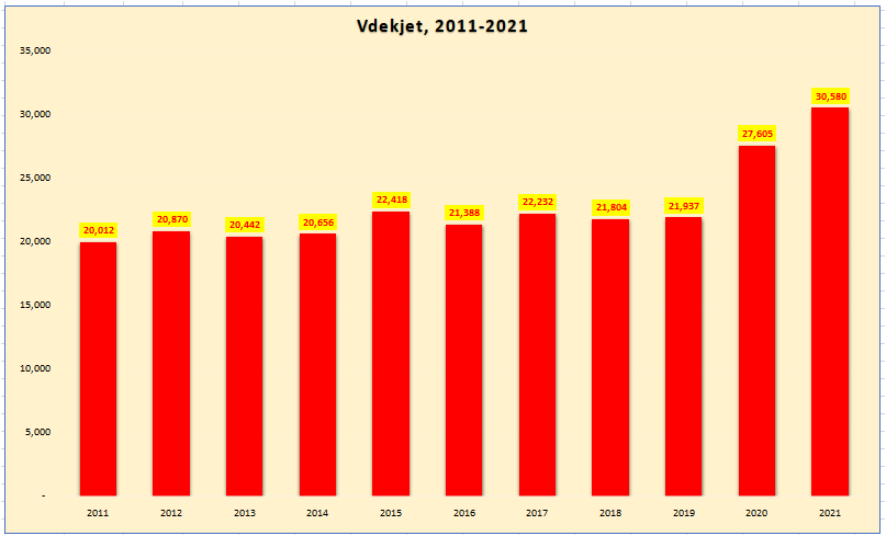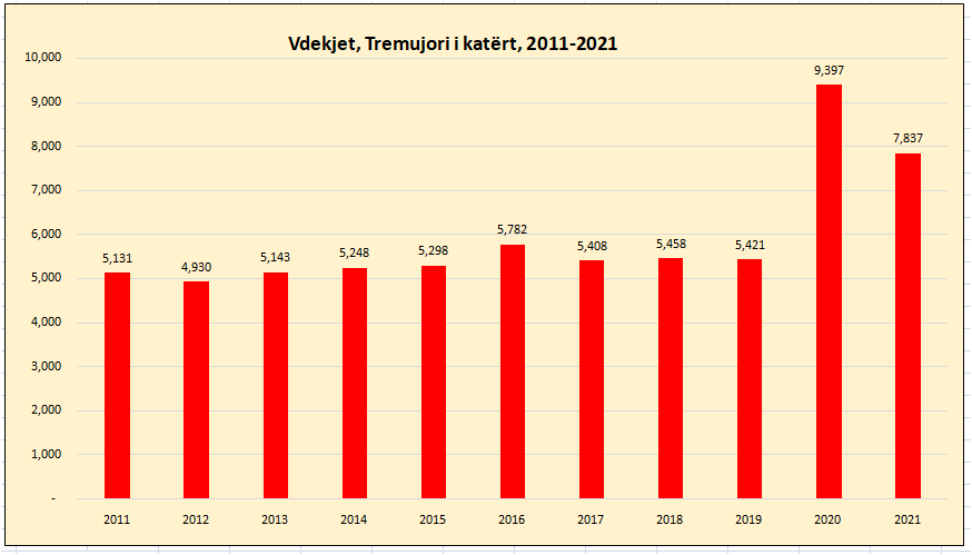 Në krahasim me mesataren e 2016-2019, kur ishte një periudhë normale, vdekjet në vitin 2021 janë rritur me 40%. Edhe në 2020-n, vdekshmëria shtesë në raport me mesataren 2016-2019 u rrit me rreth 26%.