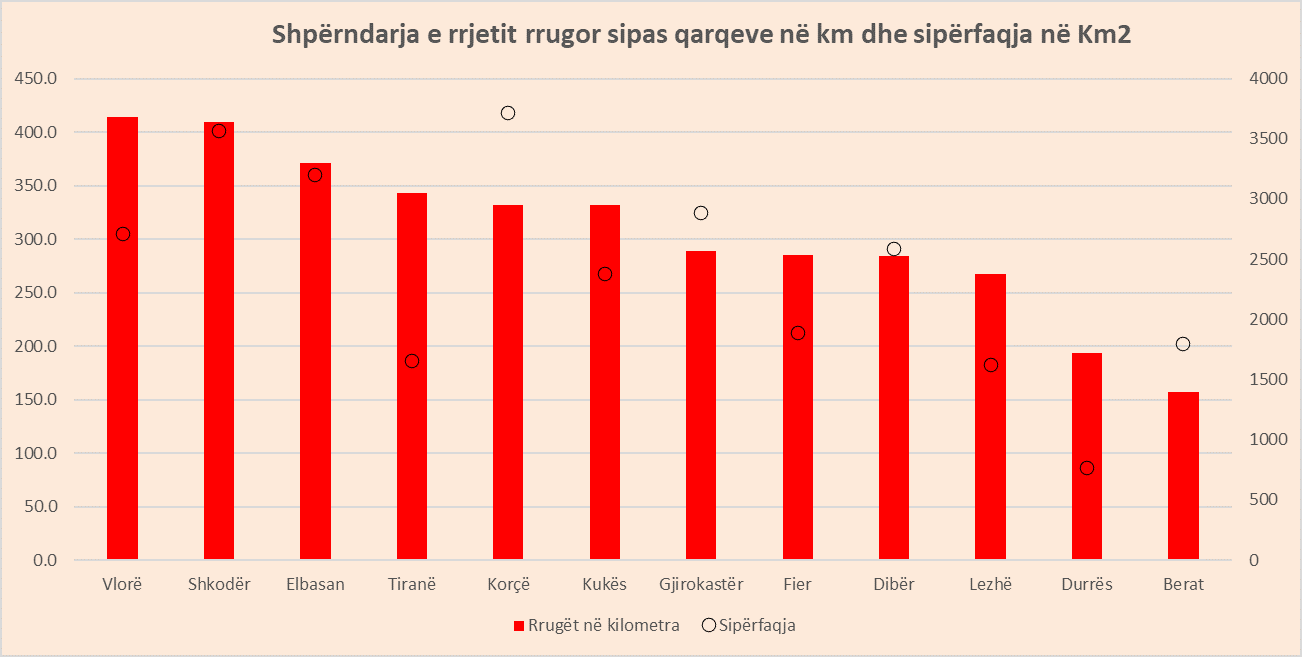Siç shihet nga grafiku i mëposhtëm gjatësia e rrugëve sipas qarqeve varet nga pozita gjeografike, po shihet se edhe bashki me të njëjtat sipërfaqe, pozitë gjeografikë dhe popullsi kanë dendësi të ndryshme të rrjetit rrugor.