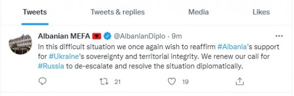 “Në këtë situatë të vështirë dëshirojmë të rikofirmojmë edhe një herë mbështetjen e #Shqipërisë ndaj sovranitetit dhe integritetit territorial të Ukrainës. Ne ripërtërijmë thirrjen tonë për Rusinë që të ulë tensionet dhe të zgjidhë situatën në mënyrë diplomatike.”- thuhet në postimin e Ministrisë për Evropën dhe Punët e Jashtme.