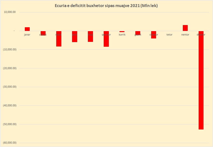 Siç shihet nga grafiku bashkëngjitur situacioni buxhetor 2021 në të ardhura dhe shpenzime në muaj të ndryshëm ka rezultuar suficitar. Psh në janar të vitit 2021 të ardhurat buxhetore ishin 2 miliardë lekë më të larta se shpenzimet, më tej gjatë nga shkurti në shtator shpenzimet ishin sistematikisht më të larta se të ardhurat, por diferencat ishin më të ulëta se plani. Në tetor, nëntor shpenzimet ishin më të larta se të ardhurat duke rezultuar me suficit, por në dhjetor deficiti u thellua me rreth 53 mld lekë.
