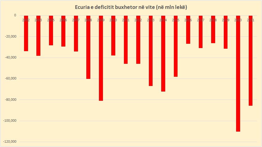 Gjithashtu realizimi faktik i deficitit të këtij viti ishte 22 % më i ulët se i vitit 2020, ku si rrjedhojë e paketave të ndihmës për përballimin e pandemisë qeveria e realizoi deficitin buxhetor në nivelin më të lartë historik prej 110,3 miliardë lekësh.