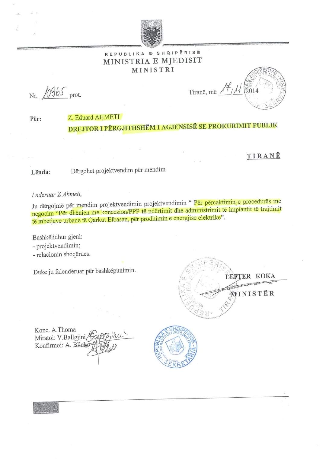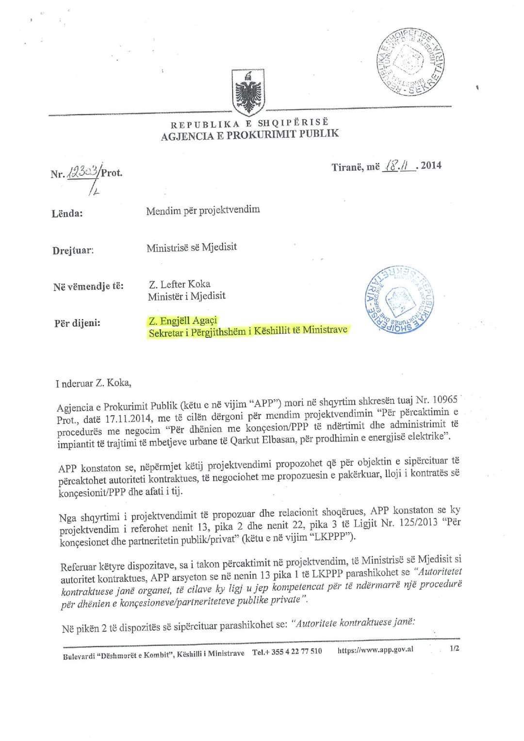 Në datën 11.11.2014, ministri i Mjedisit Lefter Koka i drejton një shkresë Agjencisë së Prokurimit Publik (APP) duke i kërkuar dhënien e mendimit lidhur me projektvendimin për procedurën e dhënies me koncesion të inceneratorit të Elbasanit, në procedurën përzgjedhëse ME NEGOCIM PA SHPALLJE PARAPRAKE TË NJOFTIMIT TË KONTRATËS (shih fotot 1&2).