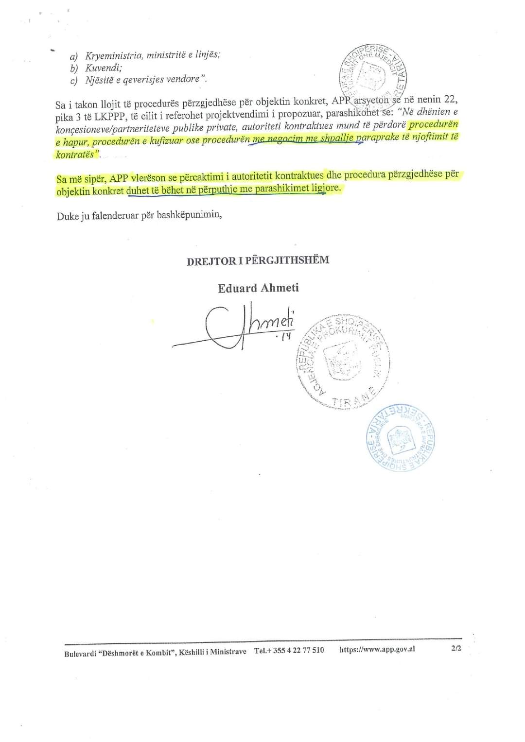 Një ditë më pas, në datën 18.11.2014, APP i kthen përgjigje ministrit Koka, duke cituar nenin 22, pika 3 të ligjit nr. 125/2013 “Për koncesionet dhe partneritetin publik/privat”, sipas të cilit për dhënien e koncesioneve/PPP mund të përdoren vetëm njërën nga tri procedurat: PROCEDURËN E HAPUR, PROCEDURËN E KUFIZUAR DHE PROCEDURËN ME NEGOCIM ME SHPALLJE PARAPRAKE TË NJOFTIMIT TË KONTRATËS (shih foton 4&5).