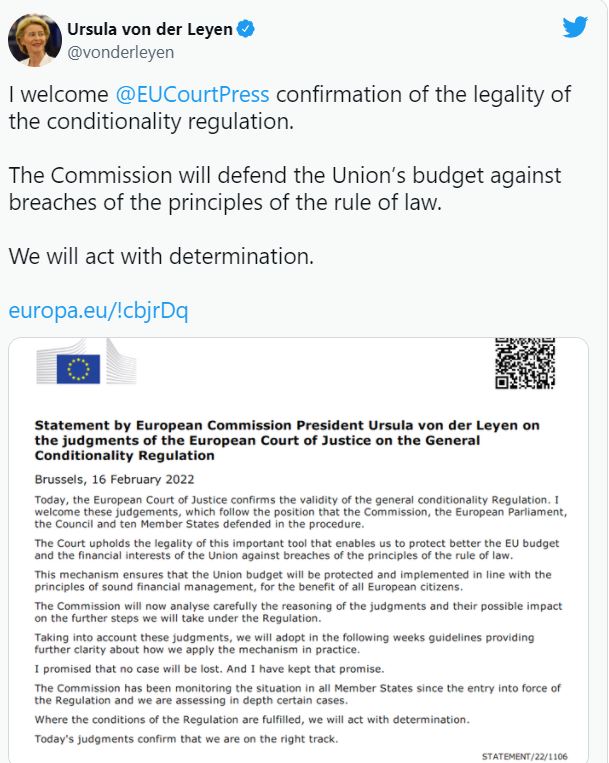 “Komisioni do të mbrojë buxhetin e Unionit kundër shkeljeve të parimeve të shtetit të së drejtës. Ne do të veprojmë me vendosmëri”, tha drejtuesja e saj, Ursula von der Leyen.