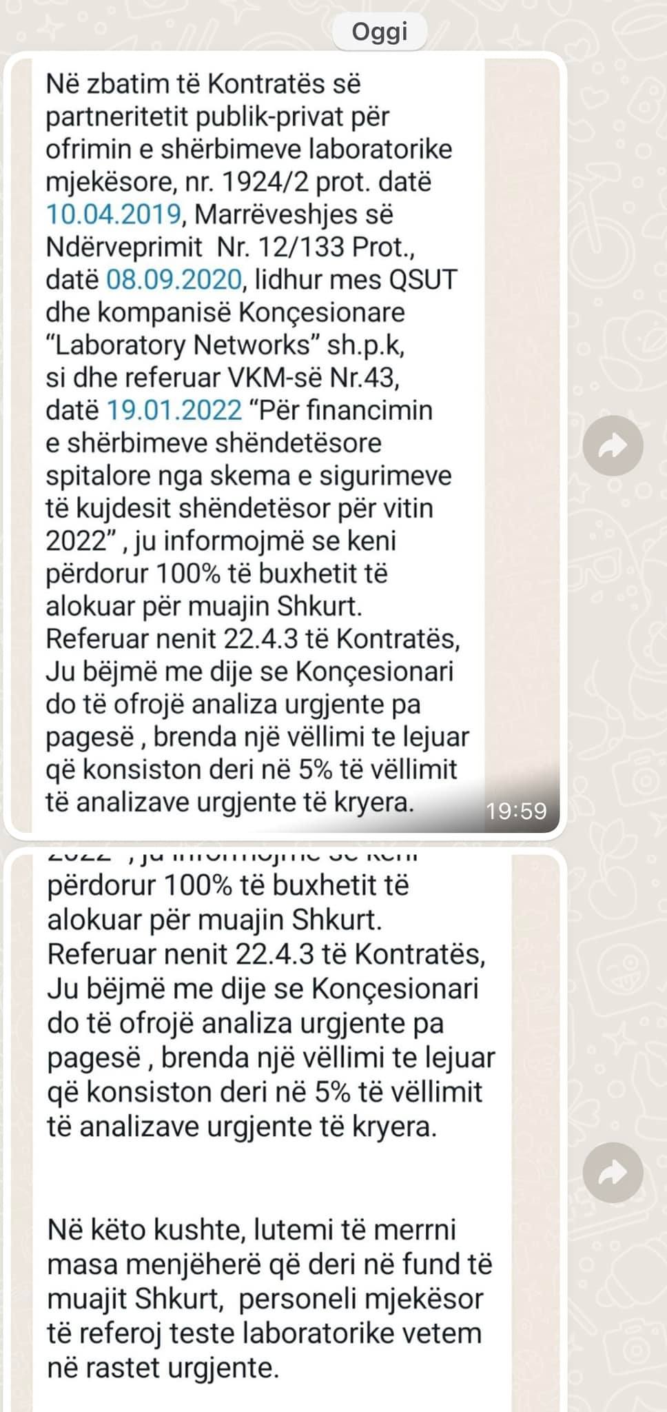 Deputeti i PD-së, Tritan Shehu ka publikuar mesazhin e shpërndarë për personelin e Qendrës Spitalore Universitare ku thuhet se deri në fund të shkurt të referohen vetëm analiza urgjente.