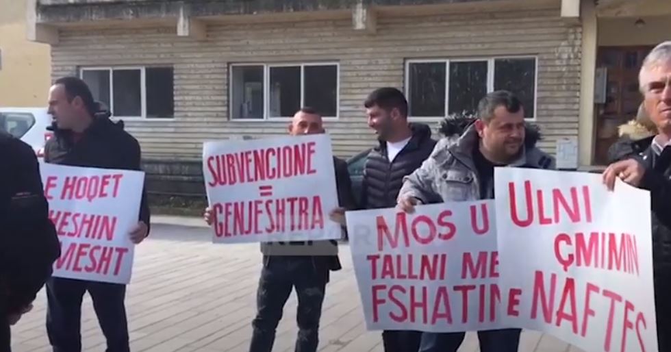 Ata mbanin në duar pankarta ku shkruhej: ‘Subvencione-Gënjeshtra’, ‘Mos u tallni me fshatin’, ‘Ulni çmimin e naftës’ e ‘Na e hoqët përsheshin me qumësht’, shkruan Shqiptarja.