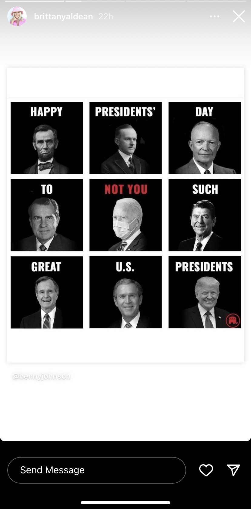 Në një meme të postuar në “Instagram”, Brittany Aldean shkruan: “Gëzuar Ditën e Presidentit për presidentët kaq të mëdhenj të SHBA-ve”. Në këtë meme tregohen portretet e ish-presidentëve Ronald Reagan, Richard Nixon, Dwight D. Eisenhower dhe Abraham Lincoln. Mes tyre edhe ish-presidenti Donald Trump.