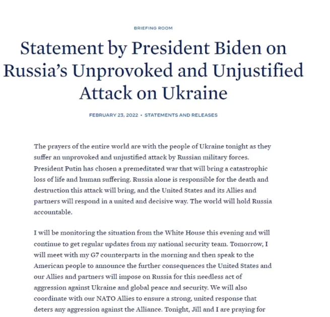Deklarata e Shtëpisë së Bardhë erdhi si përgjigje ndaj shpërthimeve në të gjithë Ukrainën, përfshirë në kryeqytetin e Kievit. Pak para fillimit të shpërthimeve, presidenti rus Putin njoftoi një ‘operacion special ushtarak’ dhe bëri thirrje për ‘çmilitarizimin’ e Ukrainës në komentet televizive.
