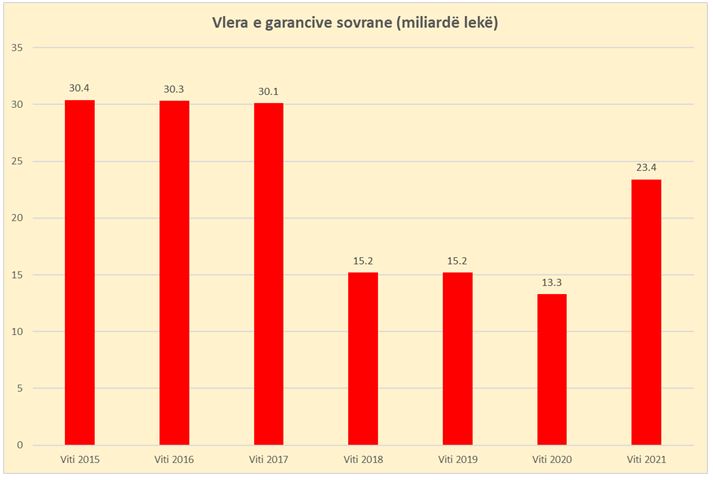 Garancitë sovrane kontabilizohen si pjesë integrale e borxhit publik dhe dhanë një kontribut shtesë, të paparashikuar në zgjerimin e këtij borxhi gjatë vitit të kaluar. Sipas shifrave që raporton MFE, në fund të vitit 2021 borxhi publik i vendit arriti në 1.38 trilionë lekë ose sa 78.15% e Prodhmit të Brendshëm Bruto. Në terma realë, borxhi publik u rrit me 2.5 pikë përqindje ndaj PBB-së vitin e kaluar./E.Shehu