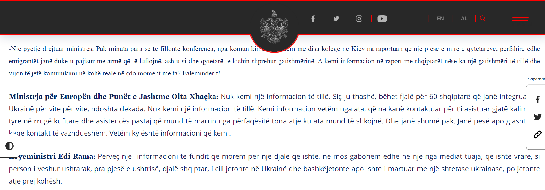 “Përveç një informacioni të fundit që morëm për një djalë që ishte, në mos gabohem edhe në një nga mediat tuaja, që ishte vrarë, si person i veshur ushtarak, pra pjesë e ushtrisë, djalë shqiptar, i cili jetonte në Ukrainë dhe bashkëjetonte apo ishte i martuar me një shtetase ukrainase, po jetonte atje prej kohësh”-deklaronte Rama.