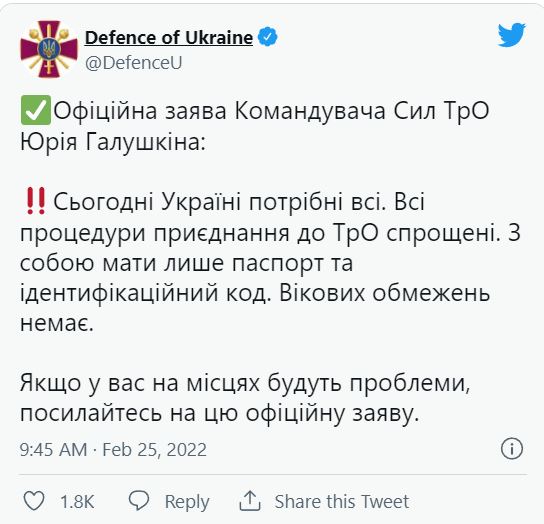 Forcat e Mbrojtjes së Ukrainës sapo kanë postuar sërish në Tëitter, duke u bërë thirrje të gjithë civilëve që të bashkohen pavarësisht nga mosha e tyre – edhe nëse janë të mitur, me sa duket.