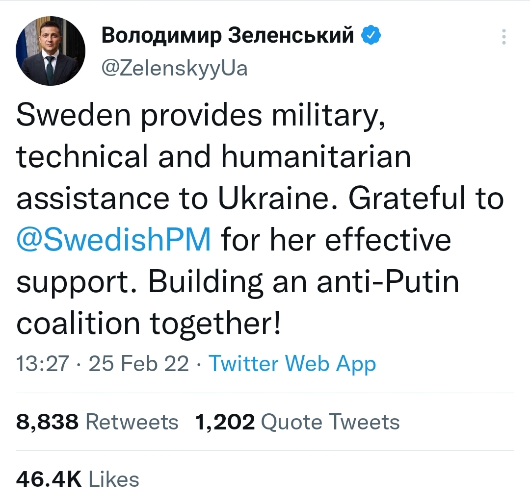 Presidenti i Ukrainës, Volodymyr Zelenskiy, ka njoftuar se Suedia i ka ofruar asistencë ushtarake, teknike dhe humanitare Ukrainës.