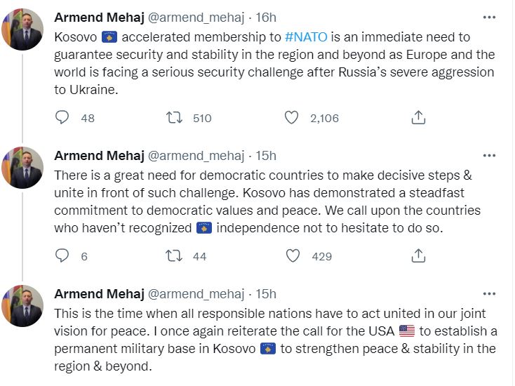Në një postim në rrjetet sociale të dielën, ministri i Mbrojtjes i Kosovës, Armend Mehaj, argumentoi se Prishtina kishte ‘nevojë urgjente’ për një ‘anëtarësim të përshpejtuar në NATO dhe krijimin e një baze të përhershme të forcave amerikane’ në funksion të sulmit rus ndaj Ukrainës.