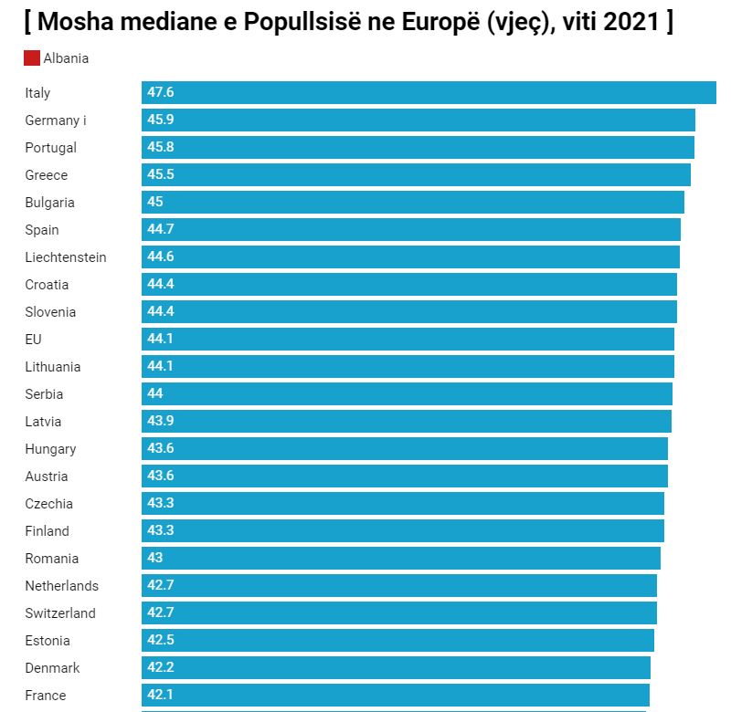 Eurostat e renditi Shqipërinë në vendin e katërt me popullsinë më të re në Europë në vitin 2021.