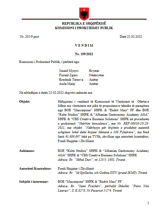 Ankesa ka ardhur nga firma konkurruese “Kube Studios” SHPK & “Albanian Gastronomy Academy AGA” SHPK & “CBS Creative Business Solutions” SHPK.