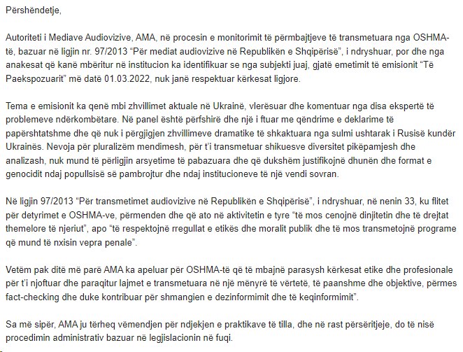 Sipas AMA-s “nevoja për pluralizëm mendimesh, për t’i transmetuar shikuesve diversitet pikëpamjesh dhe analizash, nuk mund të përligjin arsyetime të pabazuara dhe që dukshëm justifikojnë dhunën dhe format e gjenocidit ndaj popullsisë të pambrojtur dhe ndaj institucioneve të një vendi sovran”.