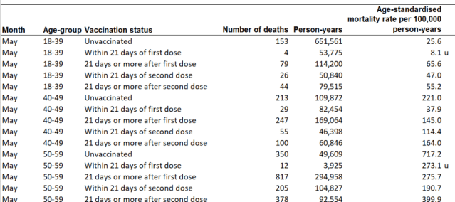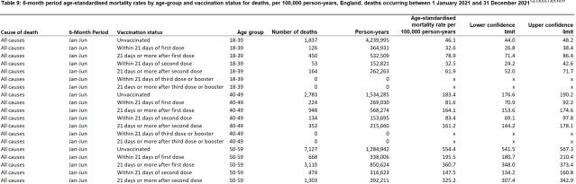 ONS ka hedhur në tabela ‘normat e tyre të vdekshmërisë mujore të standardizuara sipas sipas grupmoshës dhe statusit të vaksinimit për vdekjet për 100,000 vjet persona’, por paraqiti vetëm të dhëna për individët e moshës 18 vjeç e lart.