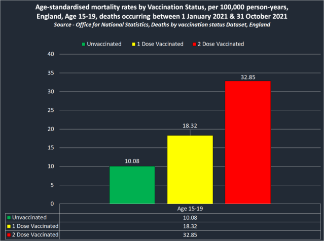 Të dhënat treguan një rritje masive të vdekjeve në mesin e adoleshentëve të vaksinuar veçmas dhe me dy vaksina në krahasim me homologët e tyre të pavaksinuar. Për fëmijët ndërmjet moshës 15 dhe 19 vjeç, rreziku i vdekjes u rrit me 82% pas dozës së parë dhe me 226% pas dozës së dytë.