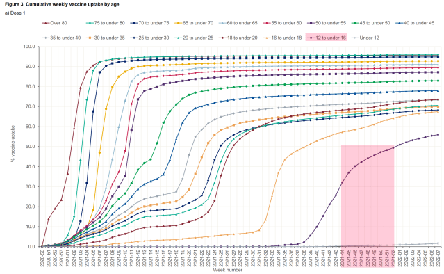 Që nga raporti i mëparshëm që përfshinte të dhënat e 31 tetorit 21, numri i fëmijëve midis moshës 12 dhe 15 vjeç që morën një vaksinë Covid-19 deri më 31 dhjetor 21, është rritur nga rreth 33% e popullsisë në rreth 50. %.