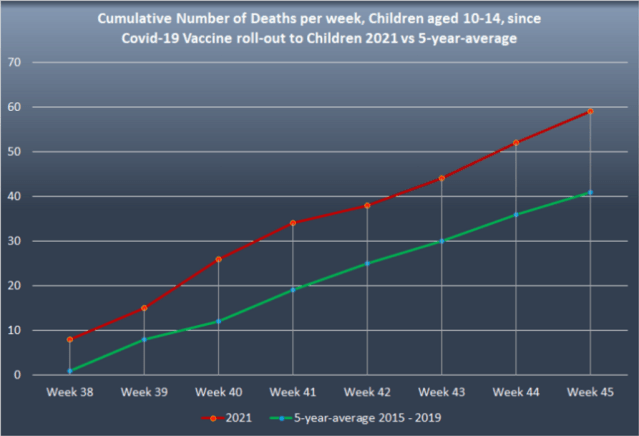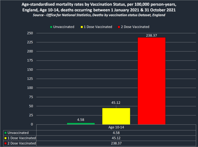 Një raport i publikuar nga Zyra për Statistikat Kombëtare më 20 dhjetor 2021, mbi vdekjet nga statusi i vaksinimit në Angli zbuloi pa dashje se fëmijët e vaksinuar kundër Covid-19 kanë deri në 52 herë më shumë gjasa të vdesin nga çfarëdo shkaku sesa fëmijët e pavaksinuar.