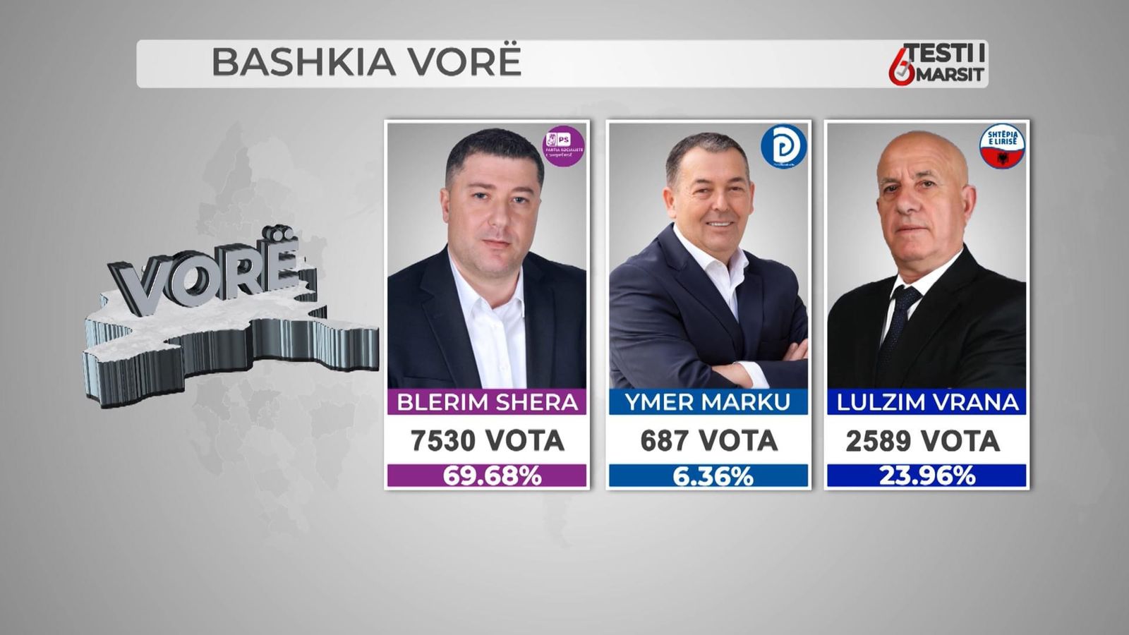 Në vend të dytë u rendit kandidati i koalicionit Shtëpia e Lirisë Lulzim Vrana me 2589 vota ndërsa kandidati i PD-së, Ymer Marku mori 687 vota.
