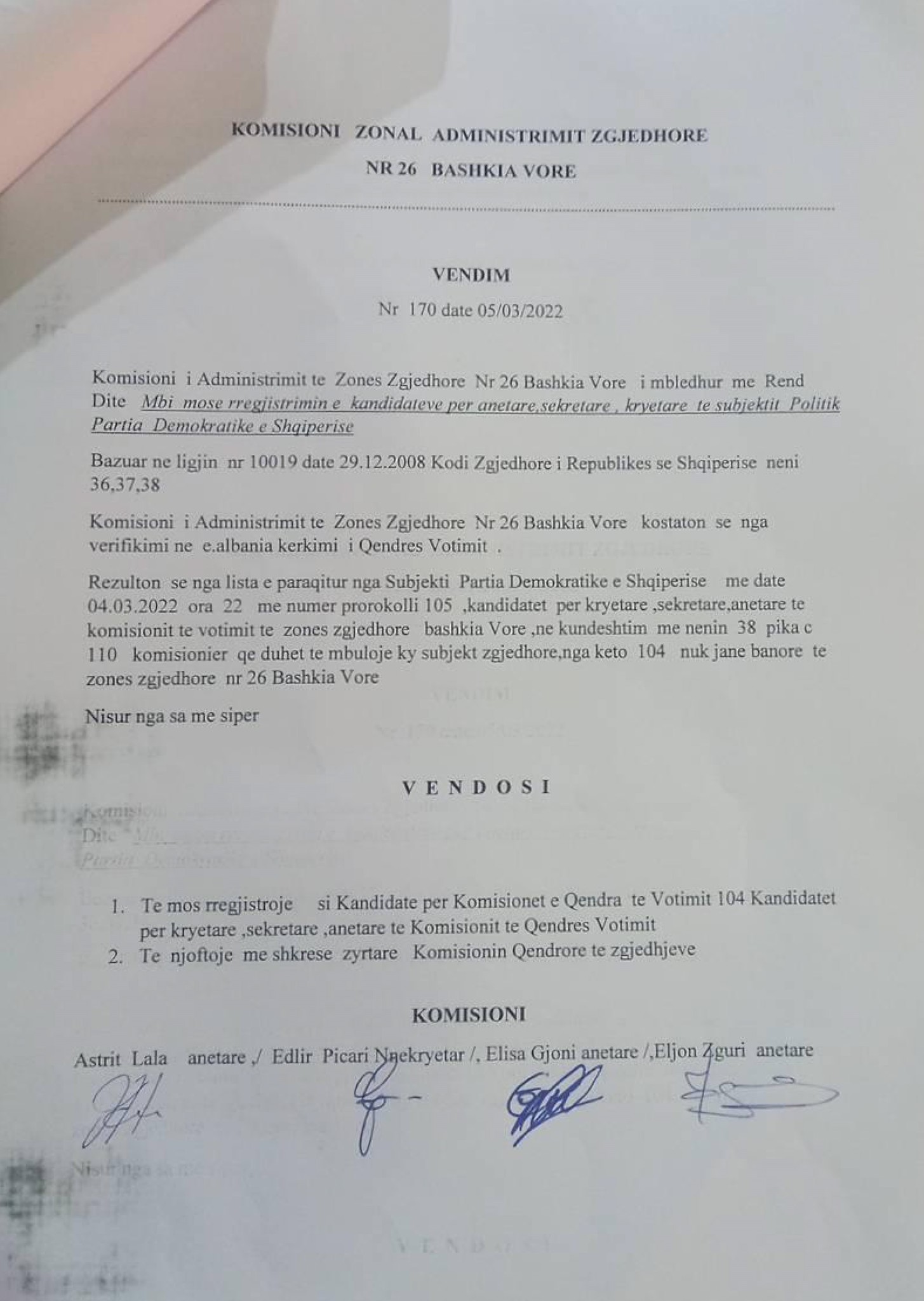 Bëhet fjalë për KZAZ-në 26 në Bashkinë e Vorës ku përfaqësuesit e PS-së dhe ata të Koalicionit Shtëpia e Lirisë kanë bashkuar votat për të larguar nga komisioni përfaqësuesit e PD-së duke deklaruar se nuk ishin banorë të zonës.