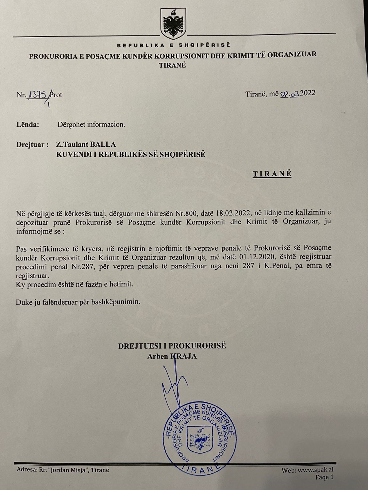 “Pas verifikimeve të kryera, në regjistrin e njoftimit të veprave penale të Prokurorisë së Posaçme kundër Korrupsionit dhe Krimit të Organizuar rezulton që, më datë 1.12.2020 është regjistruar procedimi penal nr. 287, për veprën penale të parashikuar nga neni 287 i K. Penal, pa emra të regjistruar. Ky procedim është në fazën e hetimit.“- thuhet në përgjigje të letrës.