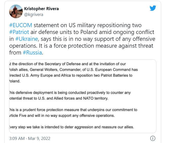Pentagoni ka thënë se do të transferojë dy bateri antiraketë ‘Patriot’ në Poloni me ftesë të Varshavës. Ushtria amerikane ka pohuar se dislokimi ishte thjesht me natyrë mbrojtëse.