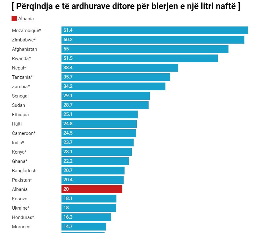 Në Mozambik, ndonëse nafta kushton më pak se një dollar, të ardhurat shumë të ulëta për frymë bëjnë që të duhen 60% e të hyrave ditore për të blerë një litër naftë. Shqipëria “konkurron” me shtete të tilla si Zimbabve, Afganistan, Ruanda, Etiopi, apo dhe Pakistan në Azi, që janë ndër vendet më të varfra të botës, duke u renditur e 17 në botë (shih grafikun në fund).