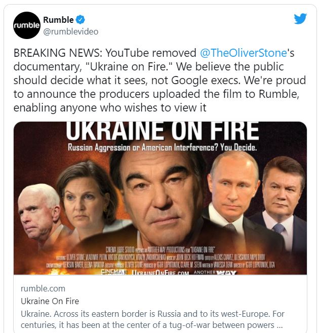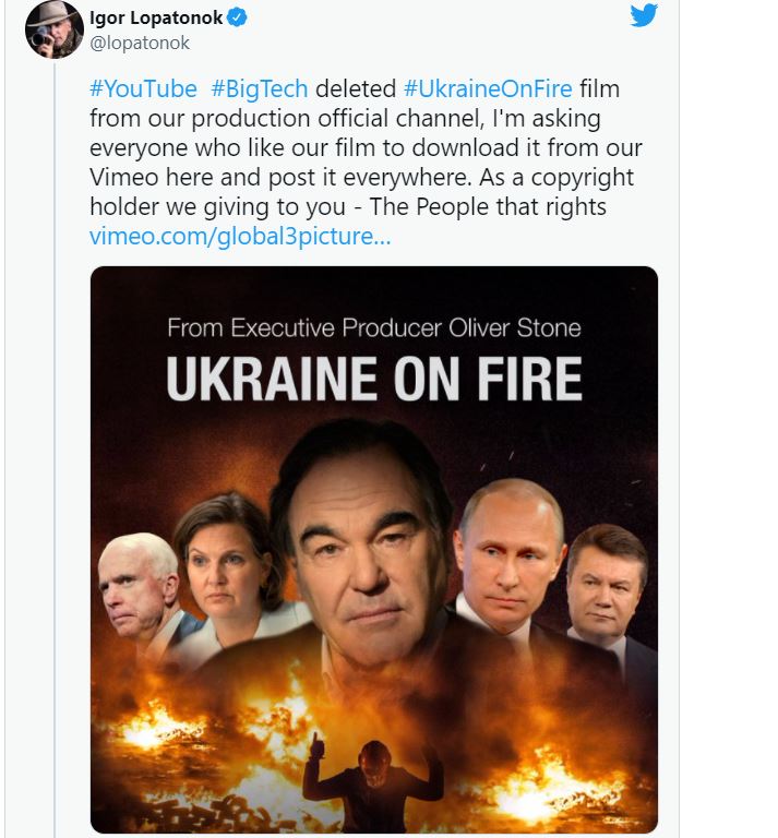 Dokumentari “Ukraina në zjarr” i vitit 2016, i cili paraqet regjisorin Oliver Stone dhe kronizon historinë e trazuar moderne të vendit, është hequr nga YouTube për shkelje të udhëzimeve të tij.