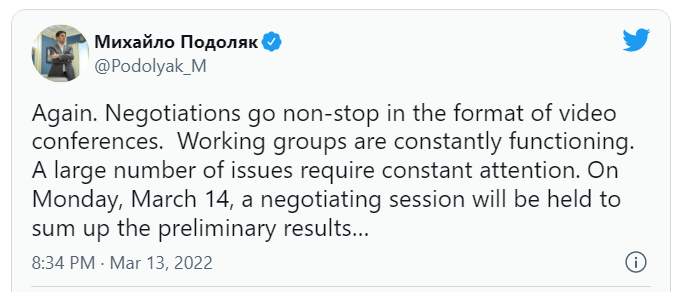 Më herët gjatë të dielës, Podolyak tha se beson që brenda ditësh do të arrihen rezultatet e para nga negociatat me Rusinë. Ai përsëriti që kërkesat e Kievit janë që të arrihet armëpushim dhe të tërhiqen trupat ruse.
