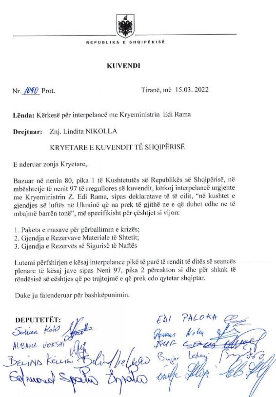Kërkesa është firmosur nga deputetët Këlliçi, Vokshi, Noka, Koti, Spaho, Paloka, Leskaj, etj.