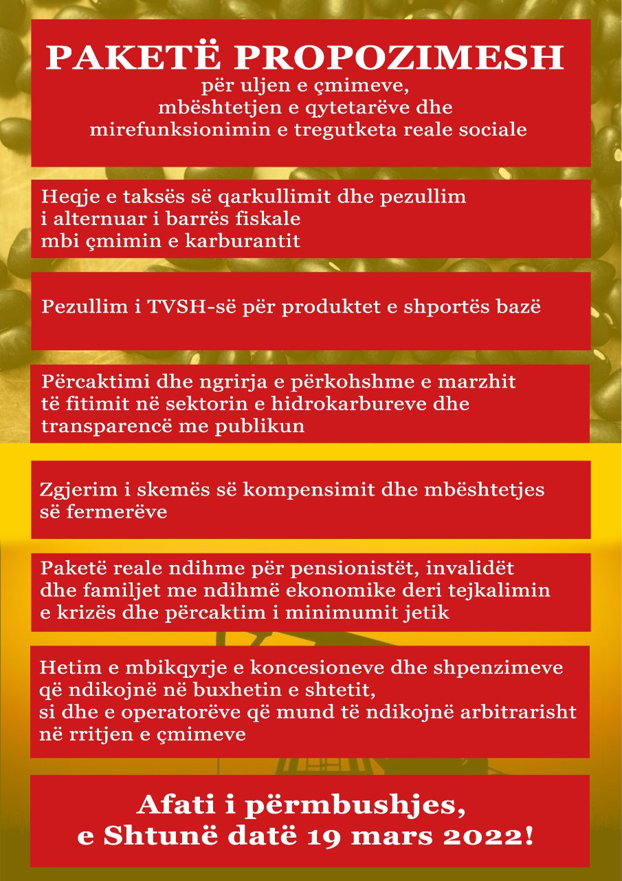 Kërkesa e përgjithshme është ulja e qëndrueshme e çmimit të karburantit me vendet e rajonit. Respektimi për shtresat vulnerabël dhe shtresave në nevojë.