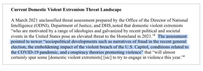 Një vlerësim kërcënimi i paklasifikuar i marsit 2021 i përgatitur nga Zyra e Drejtorit të Inteligjencës Kombëtare (ODNI), Departamenti i Drejtësisë dhe DHS, vuri në dukje se ekstremistët e dhunshëm në familje ‘të cilët janë të motivuar nga një sërë ideologjish dhe të galvanizuar nga ngjarjet e fundit politike dhe shoqërore në Shtetet e Bashkuara përbëjnë një kërcënim të lartë për atdheun në vitin 2021’.