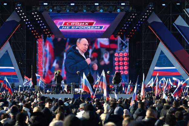 Putin po mbante një fjalim në përvjetorin e tetë të aneksimit rus të Krimesë, me thirrje dhe britma entuziazmi patriotik.