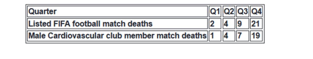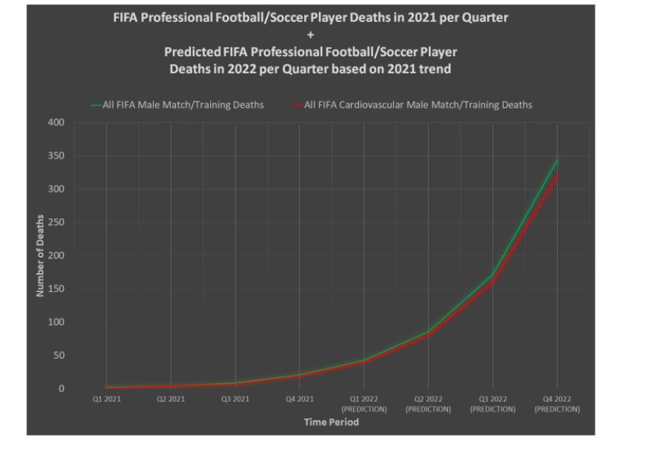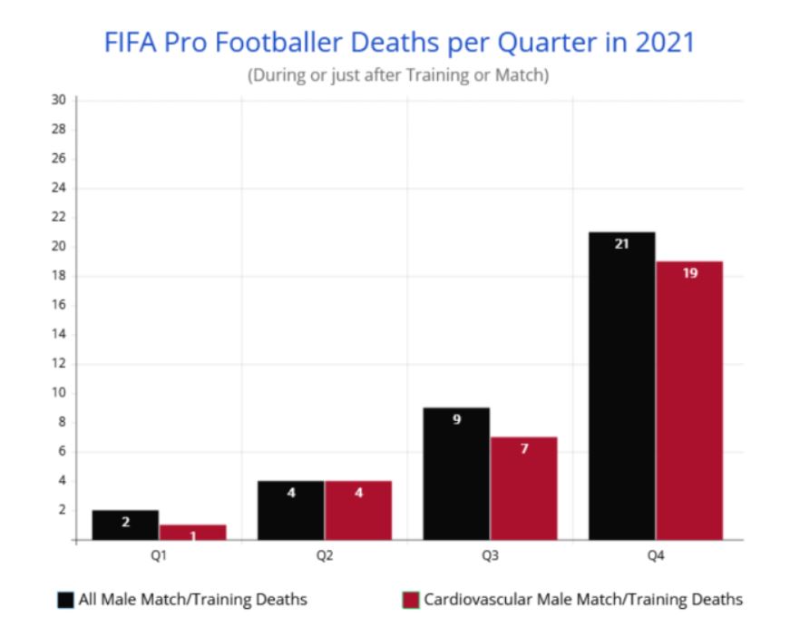 Hulumtimi i të dhënave të disponueshme tregon se vdekjet kardiovaskulare në ndeshjet profesionale të futbollit në mbarë botën në vitin 2021 ishin 300% më të larta se mesatarja 12-vjeçare, me numrin e vdekjeve të ndodhura vetëm në dhjetor 2021 që barazohet me mesataren 2009-2020.