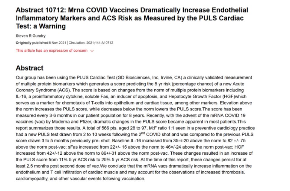 Shkalla e dështimit akut kardiak tani është 475 herë më e lartë se norma bazë normale në VAERS. Shkalla e takikardisë është 7,973 herë më e lartë se norma bazë. Infarkti akut i miokardit është 412 herë më i madh se niveli bazë. Shkalla e hemorragjisë së brendshme, trombozës së arterieve periferike, mbylljes së arteries koronare janë mbi 300 herë më shumë se norma bazë.
