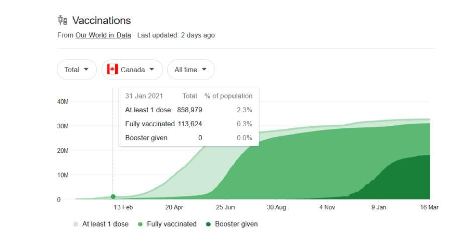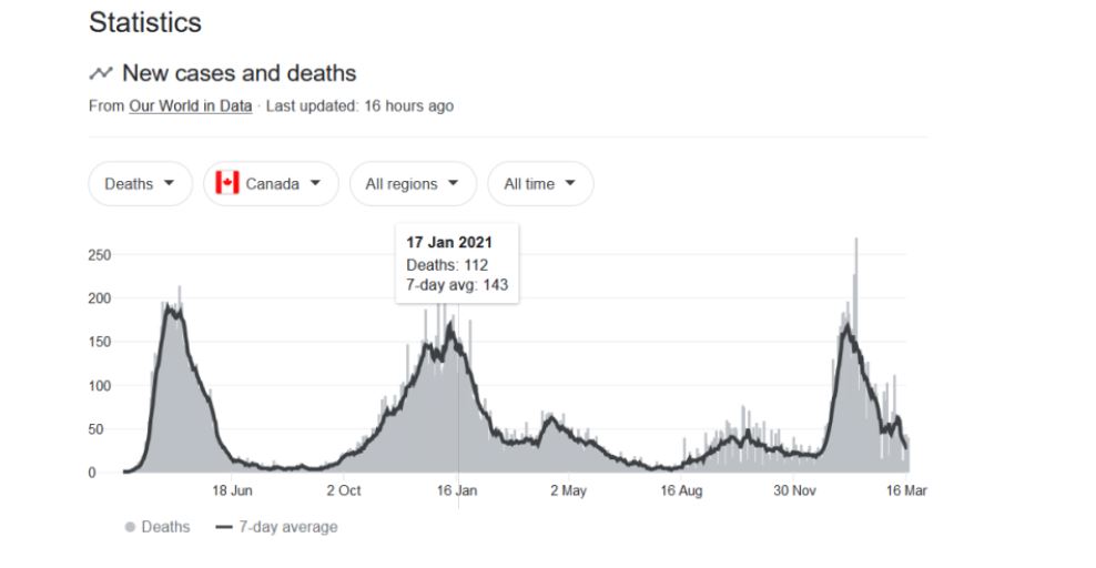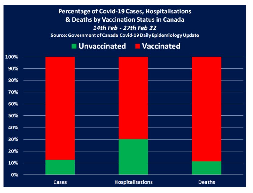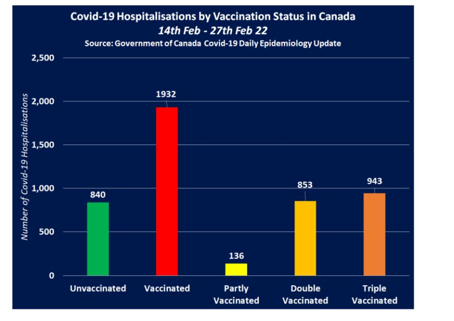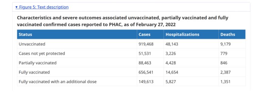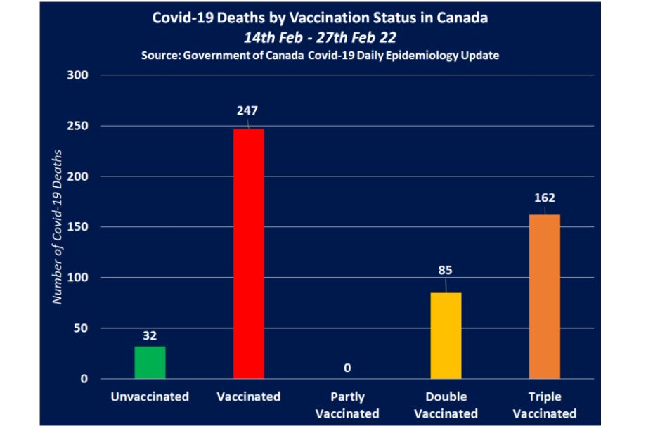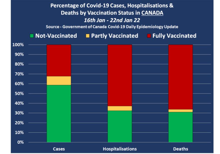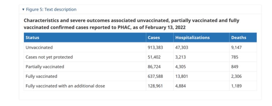 Prandaj, duke dhënë vetëm një numër të përgjithshëm të rasteve, shtrimeve në spital dhe vdekjeve që në 14 dhjetor 2020, qeveria e Kanadasë është në gjendje të përfshijë një numër të madh të vdekjeve nga Covid-19 që ndodhën kur vetëm 113,624 kanadezë u vaksinuan plotësisht, duke dhënë përshtypjen e rreme se vaksinat Covid-19 janë jashtëzakonisht të suksesshme dhe se Kanadaja po përjeton një pandemi të të pavaksinuarve.