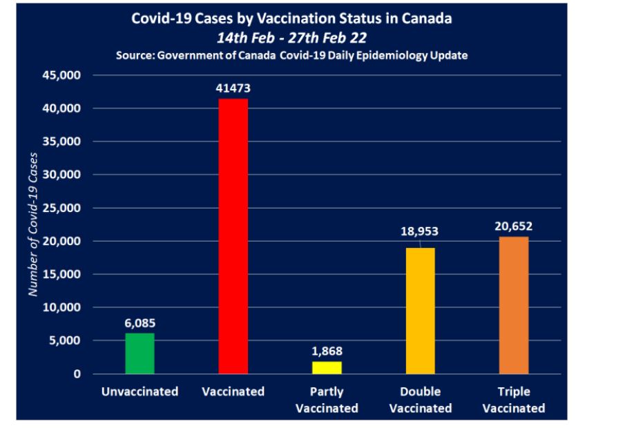 Grafiku i mëposhtëm tregon numrin e rasteve të Covid-19 në të gjithë Kanadanë sipas statusit të vaksinimit midis 14 shkurtit dhe 27 shkurtit 2022.