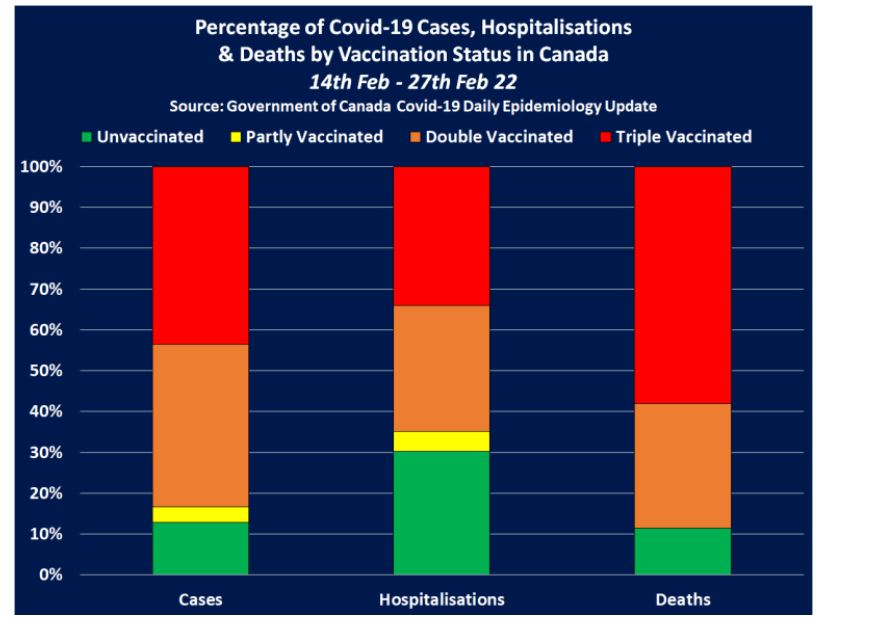 E gjithë popullsia e vaksinuar me dy e tre doza 89% ose 9 në çdo 10 vdekje nga Covid-19 në të gjithë Kanadanë midis 14 shkurtit dhe 27 shkurtit 2022.