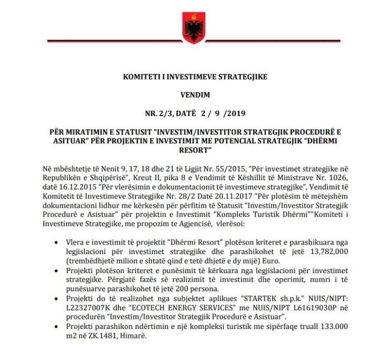 Paja ka përfituar 133 mijë metra katrorë tokë për të ndërtuar “Dhërmi Restort” një kompleks luksoz që ka fokusin turizmin elitar, tregon vendimi Agjencisë Shqiptare të Zhvillimit të Investimeve.