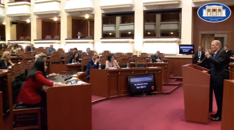 Ish-kryeministri Sali Berisha mbajti pqr pak minuta të bllokuar foltoren e Kuvendit, edhe pse drejtuesja e seancës Ermonela Felaj nuk ia dha të drejtën e fjalës.