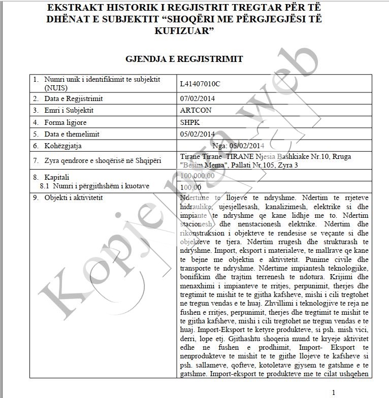 Selia qendrore e kompanisë ishte te SKY TOWER kati 13 zyra 133.