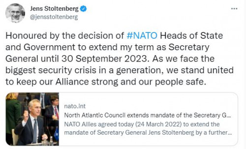 “I nderuar nga vendimi i krerëve të shteteve dhe qeverive të NATO-s për të zgjatur mandatin tim si Sekretar i Përgjithshëm deri më 30 shtator 2023. Ndërsa përballemi me krizën më të madhe të sigurisë, ne qëndrojmë të bashkuar për ta mbajtur Aleancën tonë të fortë dhe popullin tonë të sigurt.”– shkroi Stoltenberg.