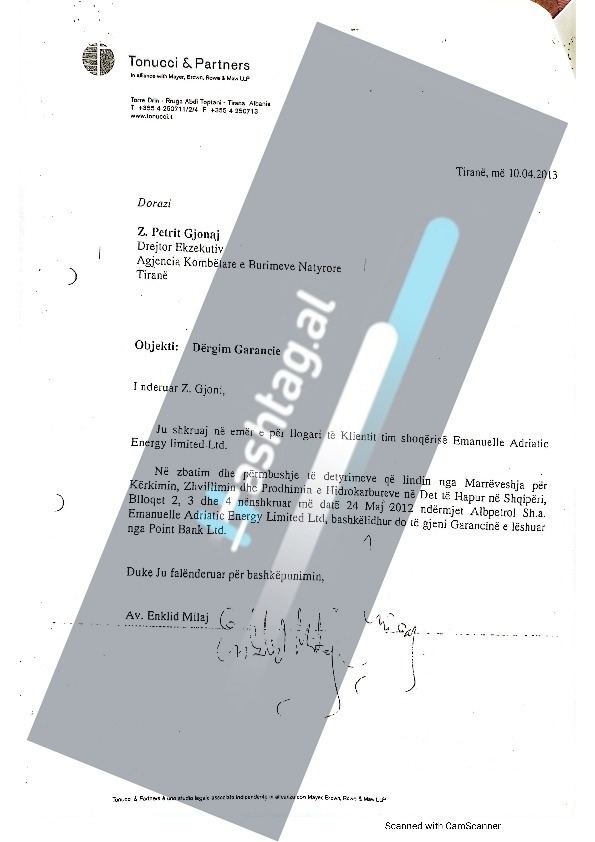 Në këtë pikë zbulohet një tjetër detaj interesant, pasi kompania “Emanuelle Adriatic Energy” ka pasur në Tiranë si përfaqësuese zyrën juridike “Tonucci Partners”. Një dokument i zbuluar nga Hashtag.al sugjeron se ishte kjo zyrë që ka sjellë në Tiranë letrat false të garancisë, ndërsa juristi i zyrës që ka bërë dorëzimin e garancisë false është shtetasi Enklid Milaj.