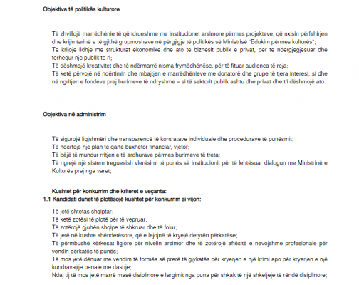 “Në zbatim të Ligjit 10352, datë 18.11.2010 ‘Për artin dhe kulturën’, i ndryshuar, si dhe kërkesave dhe procedurës së përcaktuar në Vendimin e Këshillit të Ministrave nr. 173, datë 07.03.2003 ‘Për emërimin, lirimin ose shkarkimin nga detyra të drejtuesve të institucioneve, në varësi të Këshillit të Ministrave, Kryeministrit ose Ministrit’, Ministria e Kulturës shpall konkursin për pozicionin: