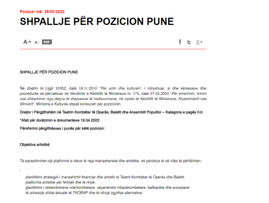 Drejtor i Përgjithshëm në Teatrin Kombëtar të Operës, Baletit dhe Ansamblit Populllor – Kategoria e pagës II-b”- thuhet në njoftimin e ministrisë. Më tej bëhet me dije se afati për dorëzimin e dokumenteve 19.04.2022.