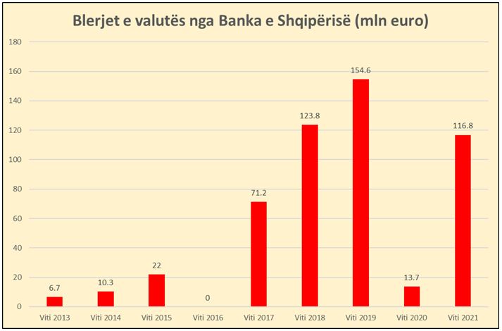 Kjo shumë është 8.5 herë më e lartë krahasuar me blerjet e realizuara gjatë vitit 2020 dhe përfaqëson shifrën e dytë më të lartë historike të blerjes së euros në tregun e brendshëm valutor. Një shumë e lartë ishte regjistruar vetëm në vitin 2019.