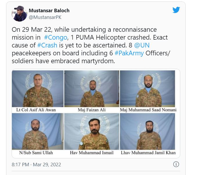 Përveç gjashtë anëtarëve pakistanezë të ekuipazhit, helikopteri mbante nënkolonelin rus Alexey Mizyura dhe nënkolonelin serb Dejan Stanojeviç, që të dy shërbenin me MONUSCO. Ushtria pakistaneze tha se të tetë vdiqën në aksident, por nuk specifikoi shkakun.